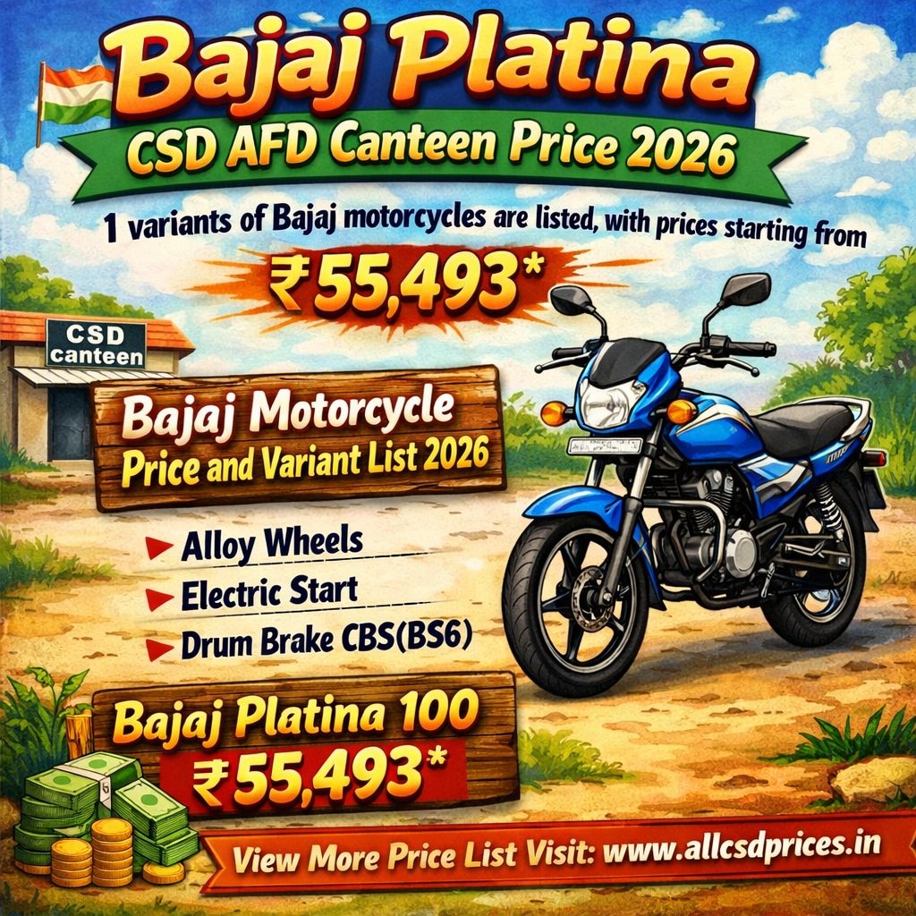 CSD AFD Canteen Bajaj Platina Price List 2026: The Bajaj Platina is available through the CSD AFD Canteen portal for eligible defence personnel in 2026. The Bajaj Platina cruiser range, known for its comfortable riding posture, low-slung design, and smooth performance, can be purchased at subsidised CSD rates compared to regular showroom prices. Final on-road cost may vary depending on RTO charges, insurance, and location.