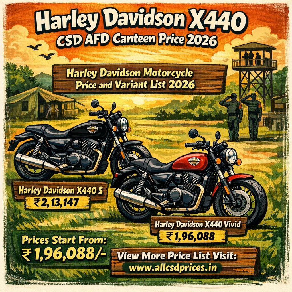 CSD AFD Canteen Harley Davidson X440 Price List 2026: The Harley-Davidson X440 is listed on the CSD AFD Canteen portal as a popular mid-segment cruiser motorcycle for defence personnel. Developed in collaboration with Hero MotoCorp, the X440 features a powerful 440cc single-cylinder engine, retro-modern styling, round LED headlamp, digital instrument cluster, and premium build quality. It is known for its strong road presence, comfortable riding posture, and smooth performance, making it a preferred choice among CSD buyers looking for a stylish and reliable cruiser.