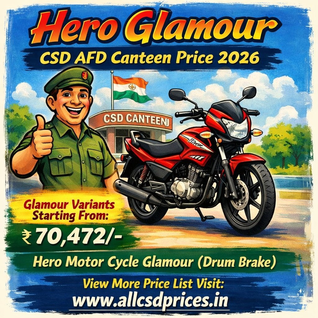 CSD AFD Canteen Hero Glamour Price List 2026: The CSD AFD Canteen Hero Glamour series, accessible via the Canteen Stores Department (AFD), provides both serving and retired defense personnel with the opportunity to purchase Hero commuter motorcycles at preferential rates. These motorcycles are recognized for their dependable performance, fuel efficiency, and minimal maintenance requirements, rendering them favored options for everyday commuting and practical applications. The CSD AFD price lists generally feature multiple Hero Glamour variants, each equipped with distinct characteristics to accommodate diverse preferences and requirements, with availability subject to change over time according to the official AFD portal listings.