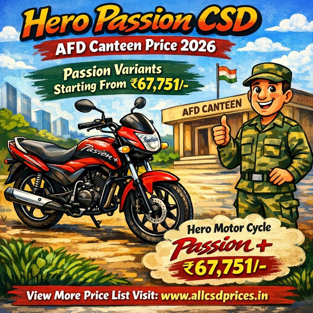 CSD AFD Canteen Hero Passion Price List 2026: The CSD AFD Canteen Hero Passion series, accessible via the Canteen Stores Department (AFD), provides both serving and retired defense personnel with the opportunity to purchase Hero commuter motorcycles at preferential rates. These motorcycles are recognized for their dependable performance, fuel efficiency, and minimal maintenance requirements, rendering them favored options for everyday commuting and practical applications. The CSD AFD price lists generally feature multiple Hero Passion variants, each equipped with distinct characteristics to accommodate diverse preferences and requirements, with availability subject to change over time according to the official AFD portal listings.