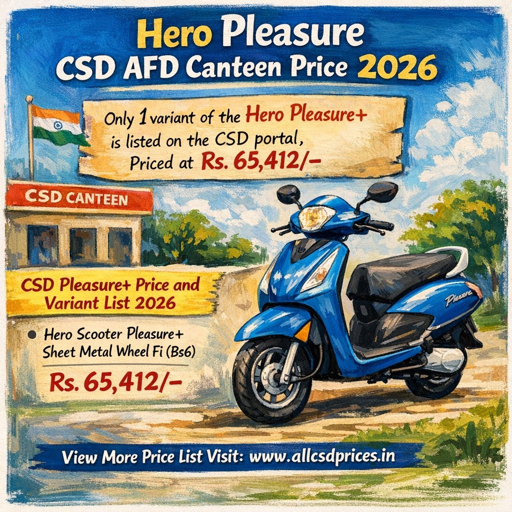 CSD AFD Canteen Hero Pleasure Price List 2026: The Canteen Stores Department (CSD) AFD canteen provides the Hero Pleasure series of scooters as part of its discounted two-wheeler offerings for qualified personnel through the official AFD online portal. These scooters are listed alongside other Hero scooters available for acquisition through the CSD AFD system, enabling members to purchase them at exclusive canteen stores department prices, featuring various models and attributes designed for daily commuting and comfort.