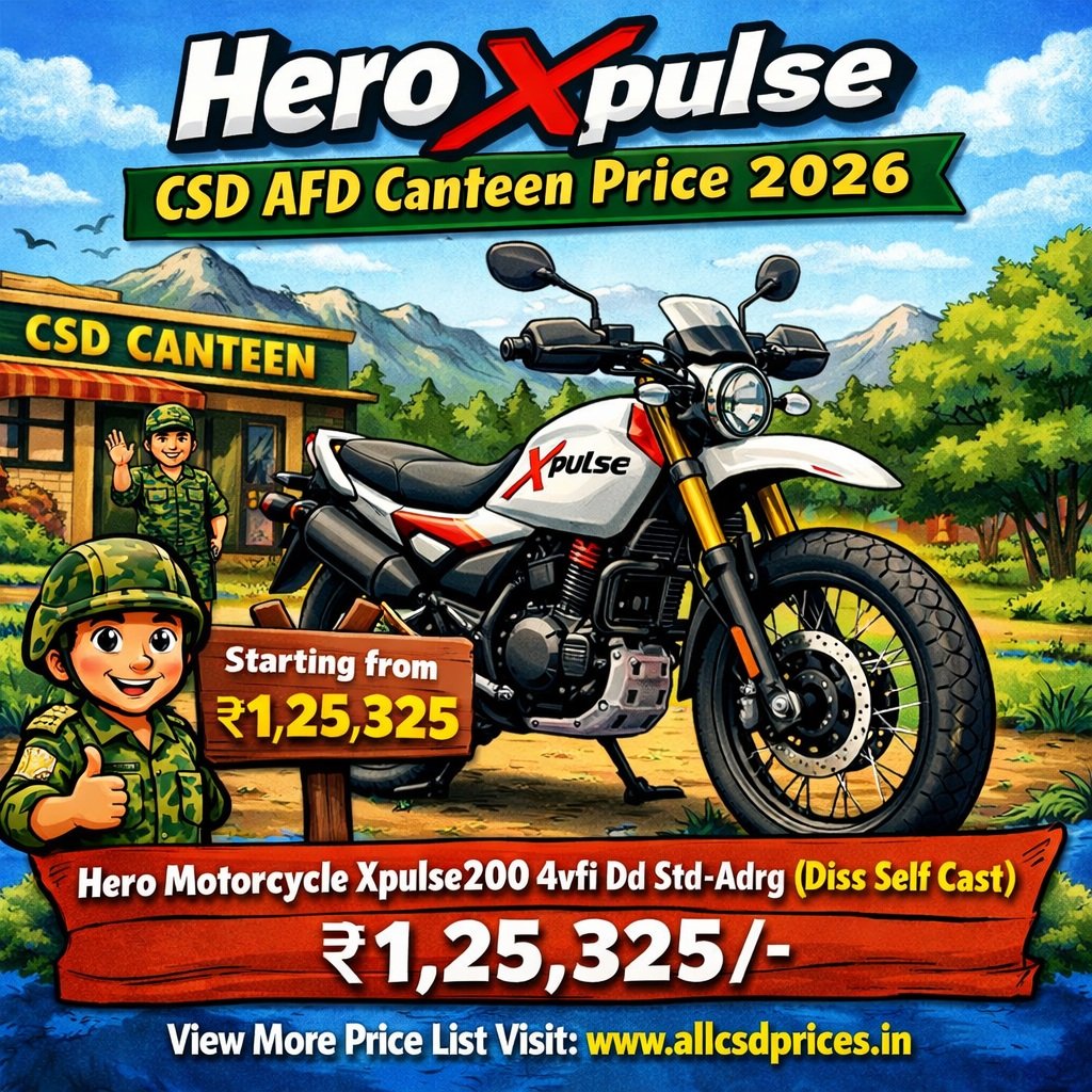 CSD AFD Canteen Hero Xpulse Price List 2026: The CSD AFD Canteen Hero Xpulse series, accessible via the Canteen Stores Department (AFD), provides both serving and retired defense personnel with the opportunity to purchase Hero commuter motorcycles at preferential rates. These motorcycles are recognized for their dependable performance, fuel efficiency, and minimal maintenance requirements, rendering them favored options for everyday commuting and practical applications. The CSD AFD price lists generally feature multiple Hero Xpulse variants, each equipped with distinct characteristics to accommodate diverse preferences and requirements, with availability subject to change over time according to the official AFD portal listings.