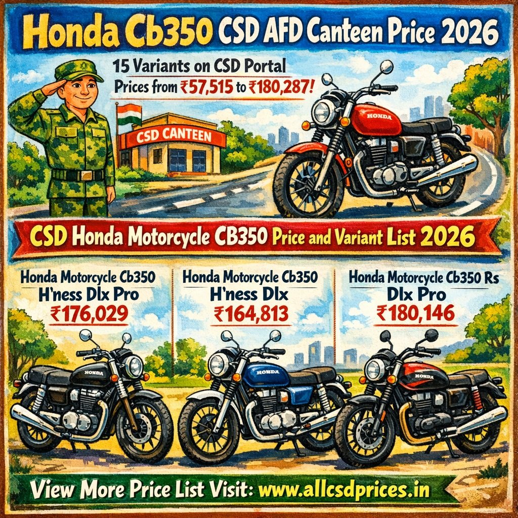 CSD AFD Canteen Honda Cb350 Price List 2026: The CSD AFD Canteen Honda Cb350 Price List 2026 provides the official list of Honda Cb350 variants available for purchase through the CSD AFD online portal for eligible defence personnel and CSD Smart Card holders. The 2026 list includes approved variants with their respective SKU codes and ordering details under the CSD scheme. The catalogue is updated periodically, and availability may vary based on depot and stock status on the AFD portal.