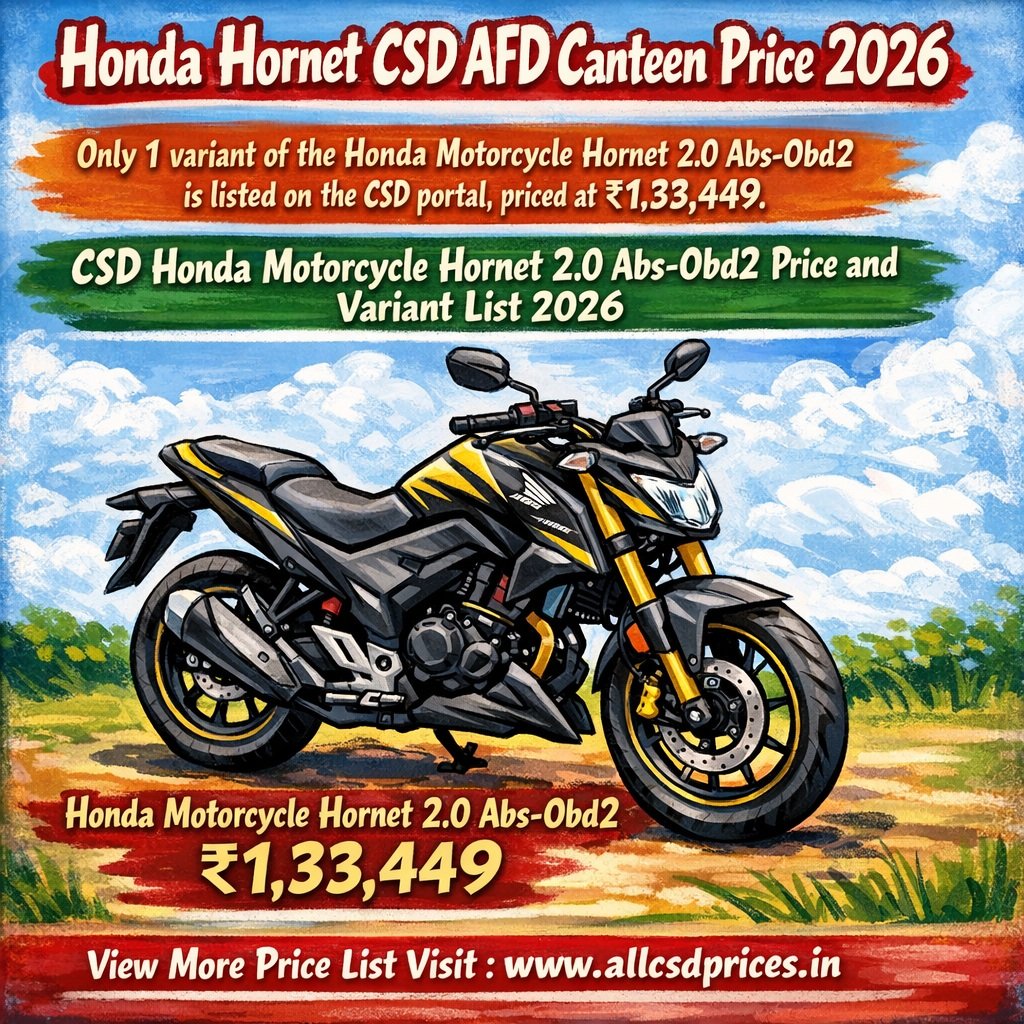 CSD AFD Canteen Honda Hornet Price List 2026: The CSD AFD Canteen Honda Hornet Price List 2026 provides the official list of Honda Hornet variants available for purchase through the CSD AFD online portal for eligible defence personnel and CSD Smart Card holders. The 2026 list includes approved variants with their respective SKU codes and ordering details under the CSD scheme. The catalogue is updated periodically, and availability may vary based on depot and stock status on the AFD portal.