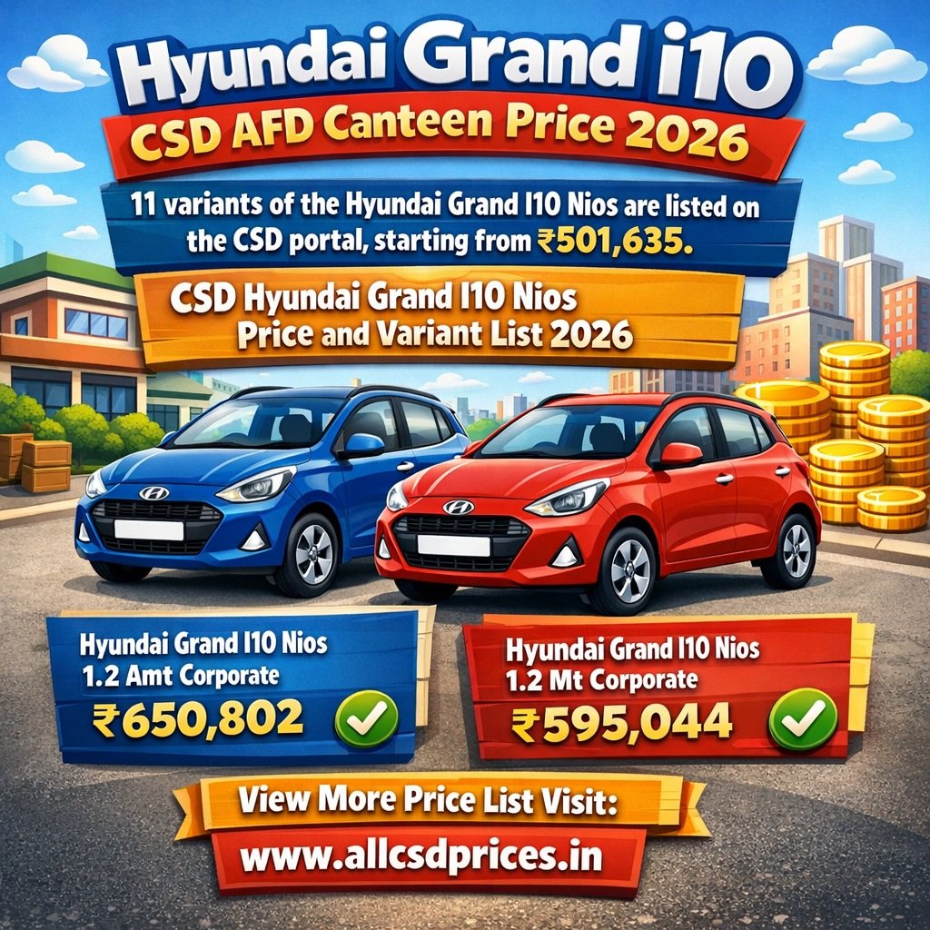CSD AFD Canteen Hyundai Grand i10 Price List 2026: The CSD AFD online portal (afd.csdindia.gov.in) lists the 2026 CSD AFD canteen price details for various cars including the Hyundai Grand i10, showing different variants available for eligible CSD members and their corresponding price points drawn from the updated CSD AFD online portal listings for 2026.