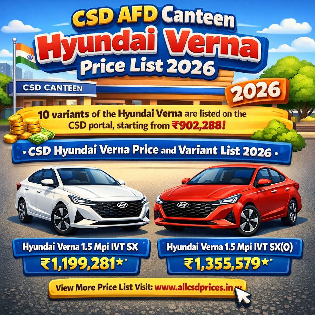 CSD AFD Canteen Hyundai Verna Price List 2026: The CSD AFD online portal (afd.csdindia.gov.in) lists the 2026 CSD AFD canteen price details for various cars including the Hyundai Verna, showing different variants available for eligible CSD members and their corresponding price points drawn from the updated CSD AFD online portal listings for 2026.