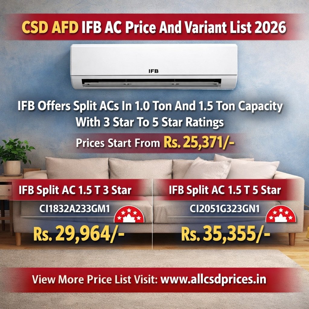 CSD AFD Canteen IFB AC Price List 2026: In the CSD AFD Canteen price list for 2026, IFB air conditioners are included among the AFD-I items available to CSD smart card holders, offering a range of models across capacities and star ratings at official CSD Canteen rates. The list reflects the IFB AC products currently listed on the CSD AFD online portal for eligible buyers this year.