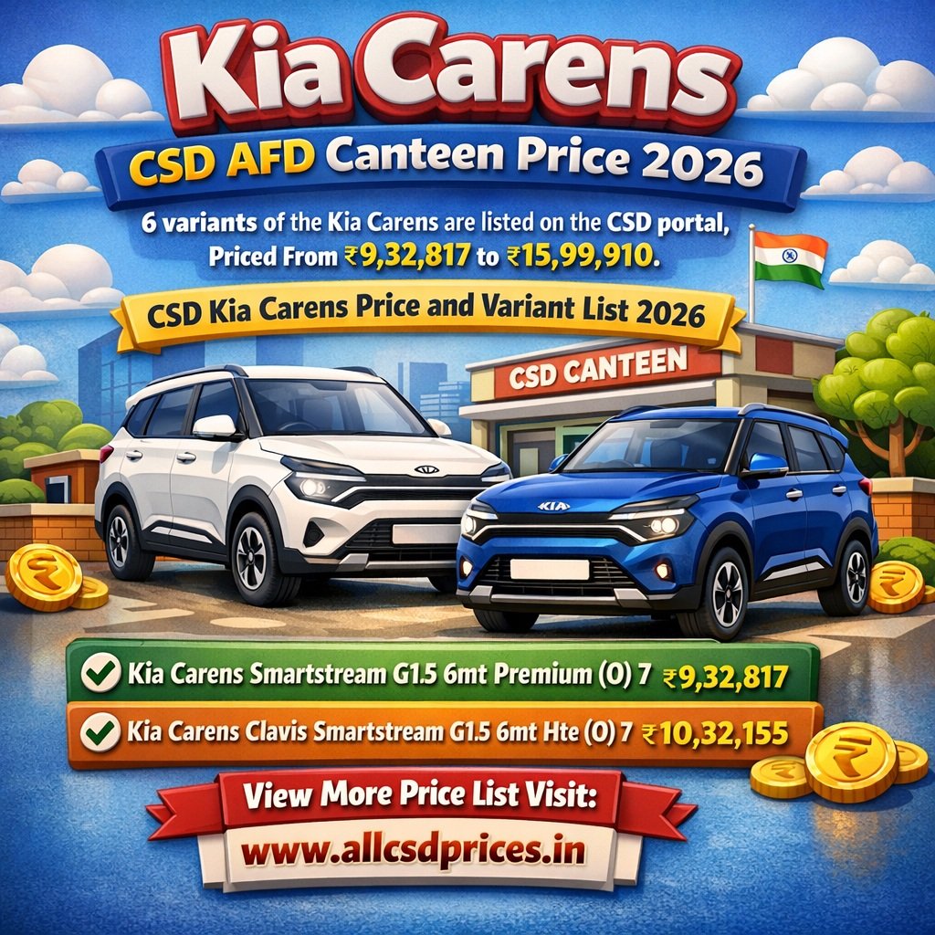 The CSD AFD Canteen Kia Carens price list 2026 refers to the official list of Kia Carens SUV variants made available for purchase by eligible CSD Smart Card holders (defence personnel) through the AFD Canteen Stores Department portal. It includes multiple petrol and diesel variants of the Carens, each listed with its respective CSD AFD catalogue codes and prices for 2026. This list helps entitled buyers see all available Sonet options under the CSD scheme and make a choice based on their eligibility and preference.