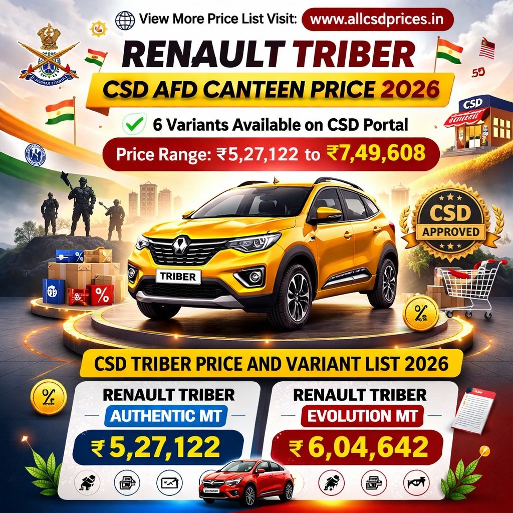 The Renault Triber is listed on the CSD AFD official portal (afd.csdindia.gov.in) as part of the Canteen Stores Department’s 2026 vehicle catalogue, making its variants available for eligible defence personnel through the AFD online system. This inclusion on the official portal facilitates access to the CSD price list for the Triber range, allowing entitled customers to view and purchase under the CSD scheme.