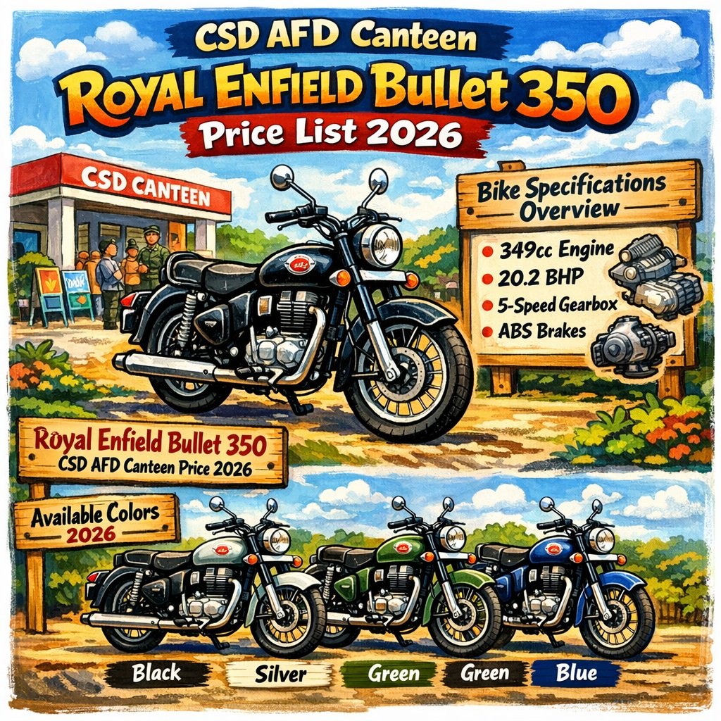 CSD AFD Canteen Royal Enfield Bullet 350 Price List 2026: The CSD AFD Canteen Royal Enfield Bullet 350 price list for 2026 refers to the official catalogue published for CSD Smart Card holders that shows the available variants of the Royal Enfield Bullet 350 through the Army/AFD CSD system. It outlines all the different trims and model options eligible for purchase under CSD benefits, helping servicemen and eligible personnel choose the specific Bullet 350 version they want from the canteen’s approved list. The list is updated periodically and reflects the current offerings available to customers through the CSD AFD portal.