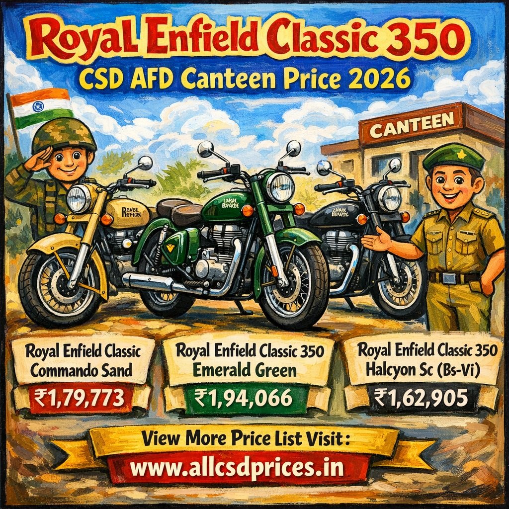 CSD AFD Canteen Royal Enfield Classic 350 Price List 2026: The CSD AFD Canteen Royal Enfield Classic 350 price list for 2026 refers to the official catalogue published for CSD Smart Card holders that shows the available variants of the Royal Enfieldx Classic 350 through the Army/AFD CSD system. It outlines all the different trims and model options eligible for purchase under CSD benefits, helping servicemen and eligible personnel choose the specific Classic 350 version they want from the canteen’s approved list. The list is updated periodically and reflects the current offerings available to customers through the CSD AFD portal.