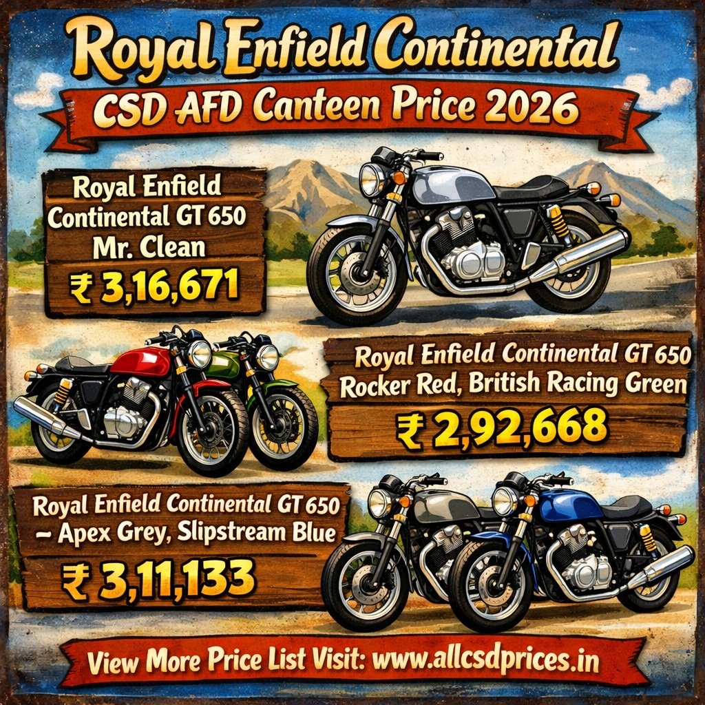 CSD AFD Canteen Royal Enfield Continental Price List 2026: The CSD AFD Canteen Royal Enfield Continental price list for 2026 refers to the official catalogue published for CSD Smart Card holders that shows the available variants of the Royal Enfield Continental through the Army/AFD CSD system. It outlines all the different trims and model options eligible for purchase under CSD benefits, helping servicemen and eligible personnel choose the specific Continental version they want from the canteen’s approved list. The list is updated periodically and reflects the current offerings available to customers through the CSD AFD portal.