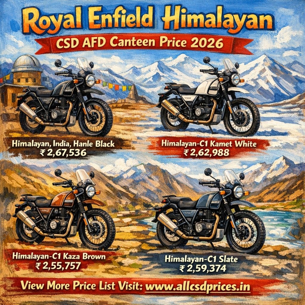 CSD AFD Canteen Royal Enfield Himalayan Price List 2026: The CSD AFD Canteen Royal Enfield Himalayan price list for 2026 refers to the official catalogue published for CSD Smart Card holders that shows the available variants of the Royal Enfieldx Himalayan through the Army/AFD CSD system. It outlines all the different trims and model options eligible for purchase under CSD benefits, helping servicemen and eligible personnel choose the specific Himalayan version they want from the canteen’s approved list. The list is updated periodically and reflects the current offerings available to customers through the CSD AFD portal.
