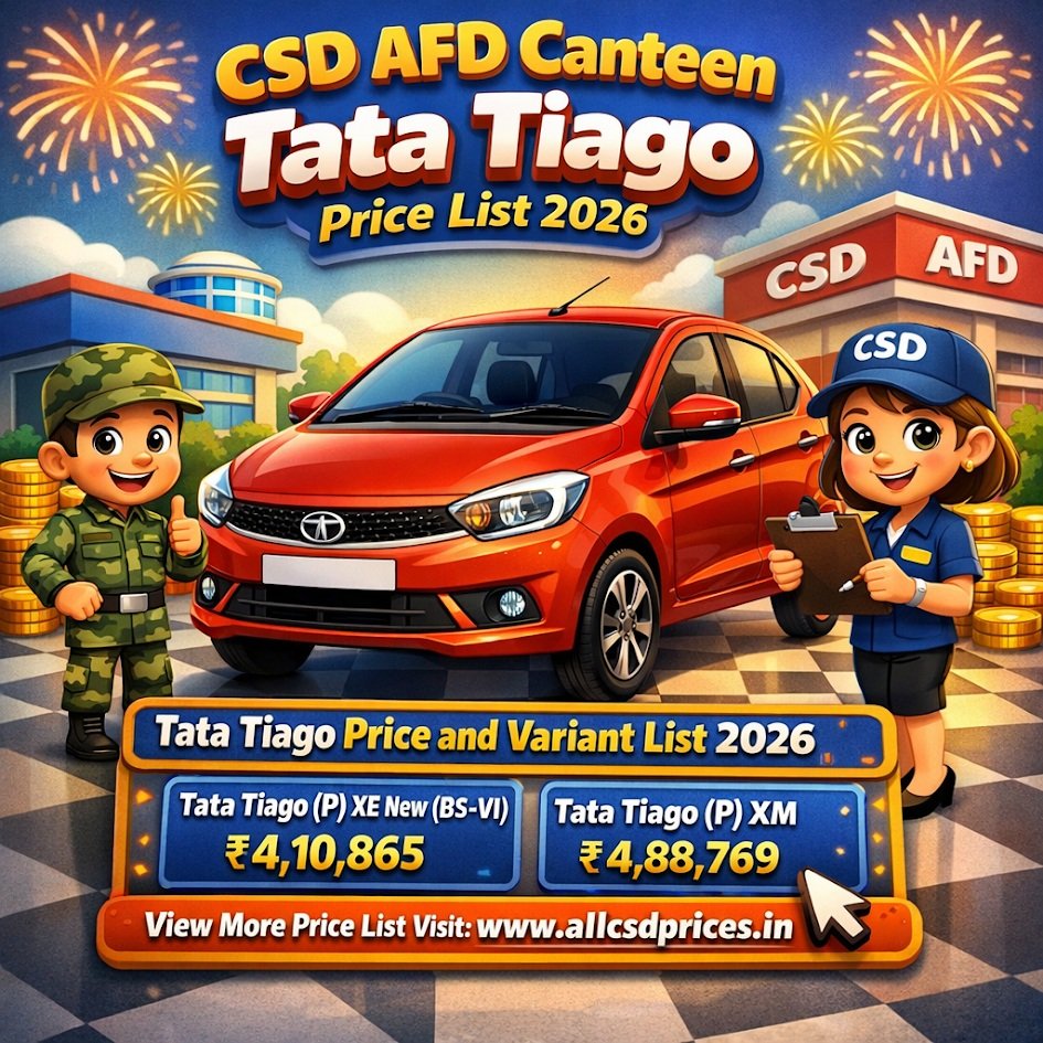 CSD AFD Canteen Tata Tiago Price List 2026: The Tata Tiago is a popular compact SUV from Tata Motors that’s also offered through the Canteen Stores Department (CSD) for defence personnel, which means buyers pay a lower GST (14% instead of the usual 28%), making it more affordable than the regular showroom model for eligible members of the armed forces.