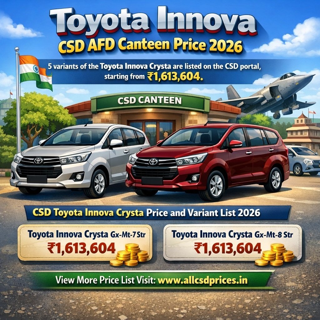 The Toyota Innova is listed on the CSD AFD official portal (afd.csdindia.gov.in) as part of the Canteen Stores Department’s 2026 vehicle catalogue, making its variants available for eligible defence personnel through the AFD online system. This inclusion on the official portal facilitates access to the CSD price list for the Innova range, allowing entitled customers to view and purchase the MPV under the CSD scheme.