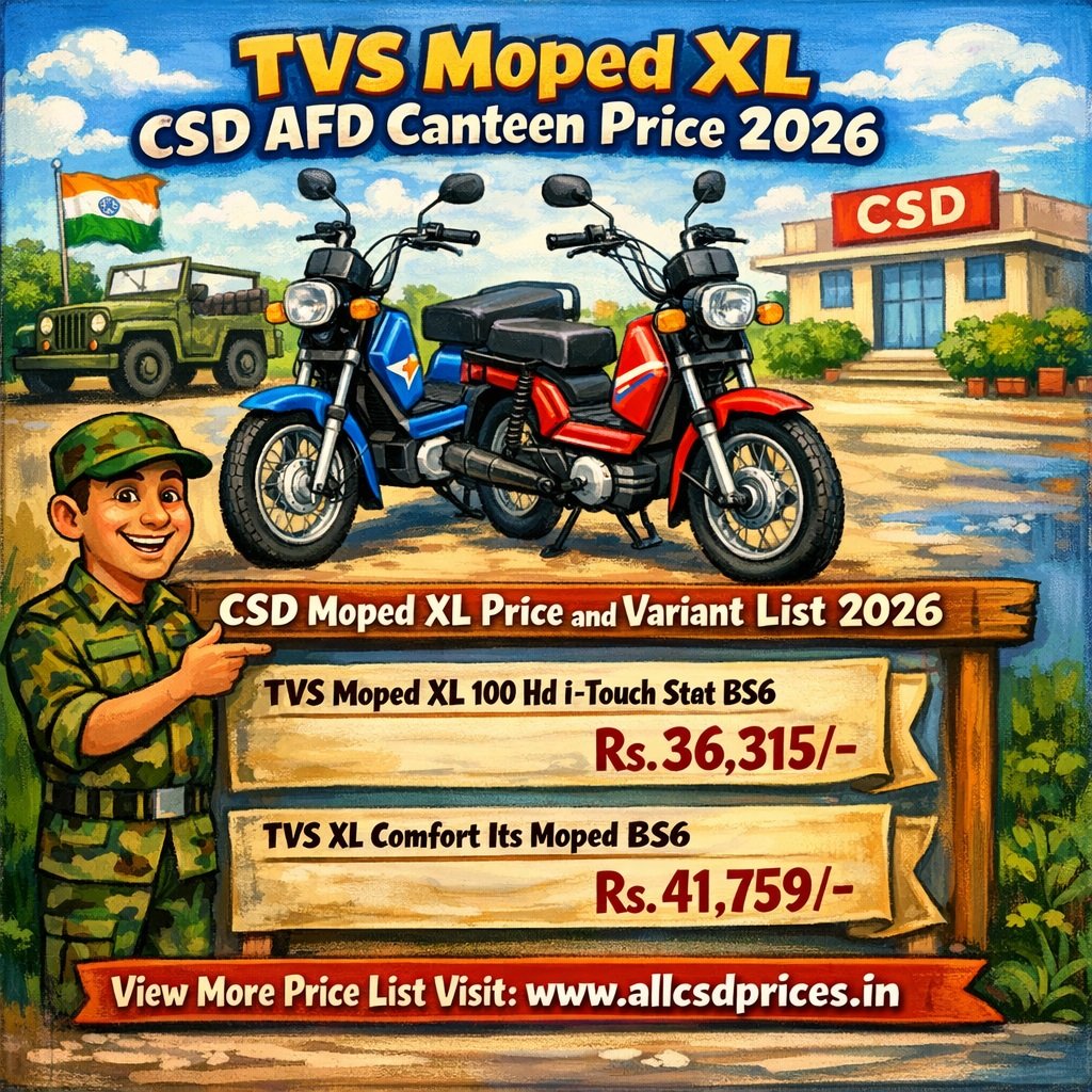 CSD AFD Canteen TVS Moped XL Price List 2026: The Canteen Stores Department (CSD) AFD online portal in India features the TVS Moped XL series among its selection of two-wheelers accessible to eligible CSD/AFD smart card holders, presenting durable and functional moped alternatives via the official AFD website. This model is included with other TVS motorcycles and scooters on the CSD AFD platform, offering defence personnel and approved beneficiaries a dependable and cost-effective mobility option under the CSD scheme, contingent upon purchase eligibility and intervals.