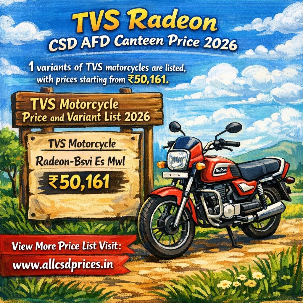 CSD AFD Canteen TVS Radeon Price List 2026: The CSD AFD Canteen TVS Radeon price list for 2026 on the official CSD AFD online portal features the TVS Radeon series as part of its two-wheeler offerings, allowing CSD smart card holders to purchase these motorcycles at subsidised CSD prices through the portal.