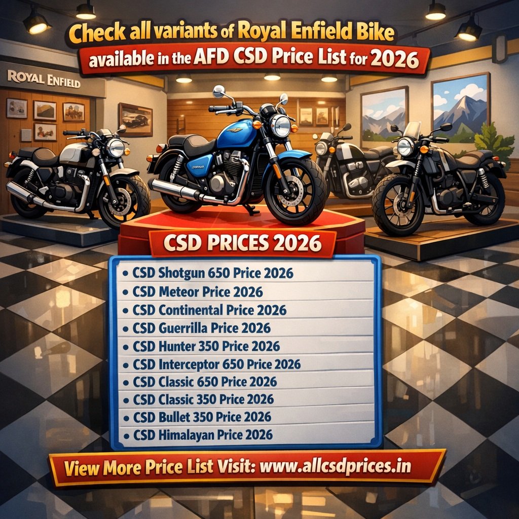Check all variants of Royal Enfield Bike available in the AFD CSD Price List for 2026