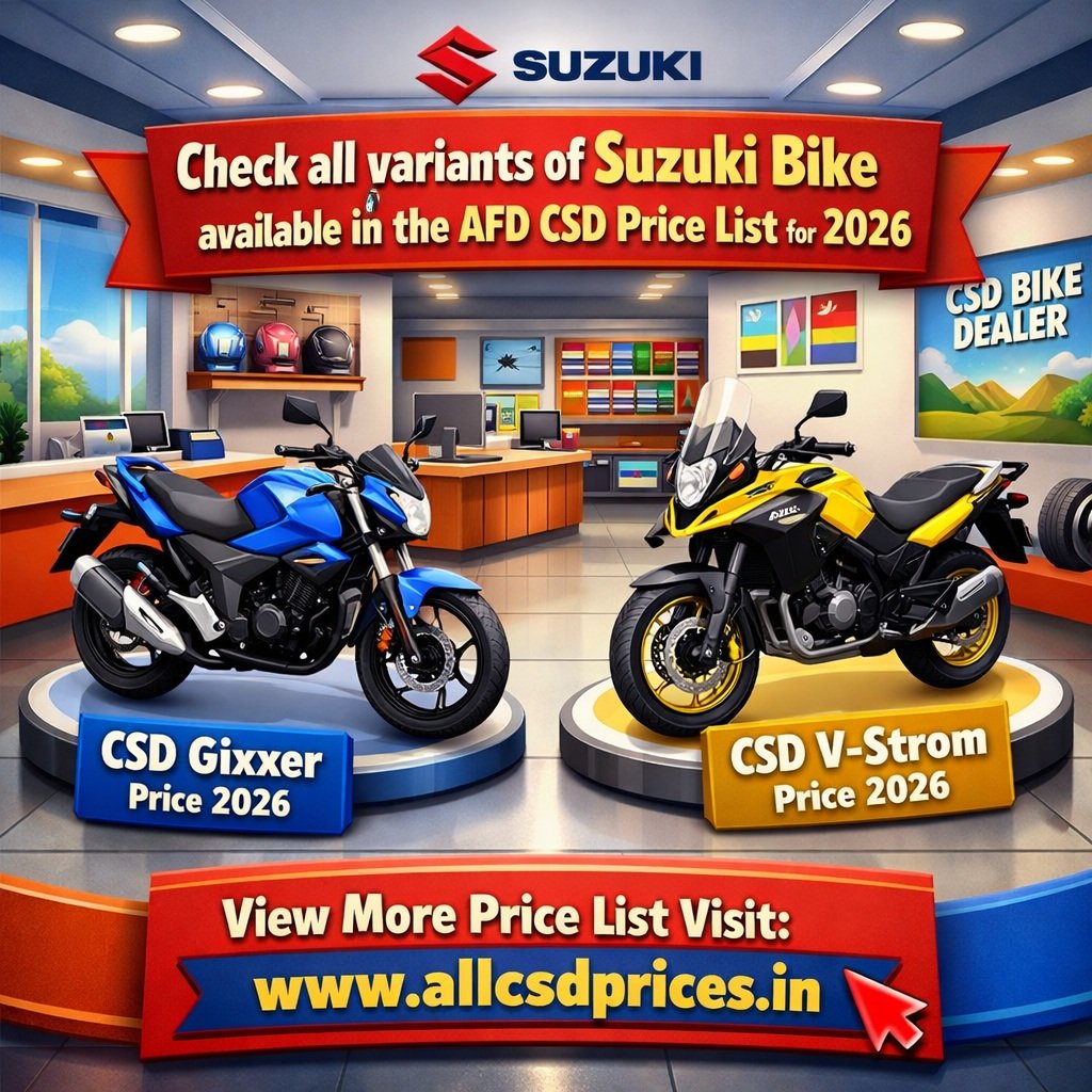 सुजुकी बाइक CSD AFD ऑनलाइन कैंटीन 2026 सभी उपलब्ध वेरिएंट के लिए प्राइस लिस्ट