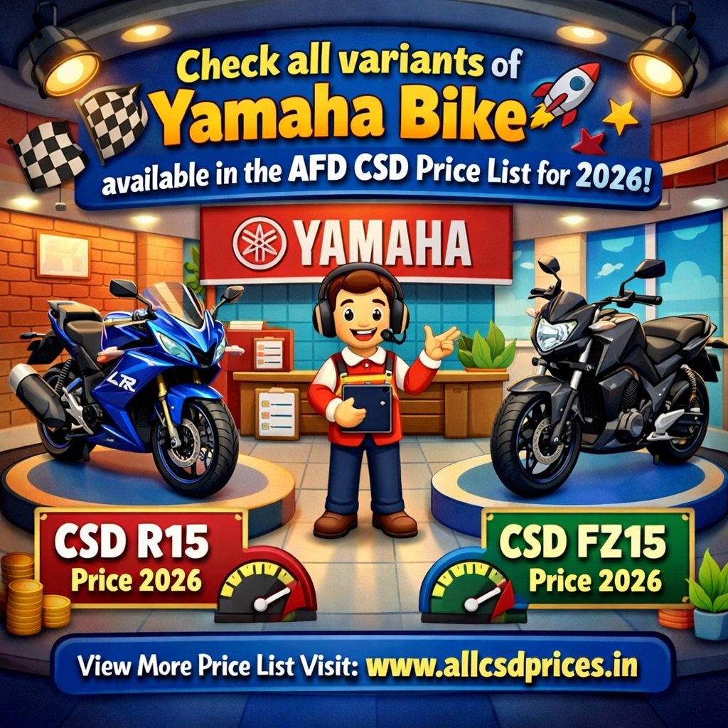 यामाहा बाइक CSD AFD ऑनलाइन कैंटीन 2026 सभी उपलब्ध वेरिएंट के लिए प्राइस लिस्ट